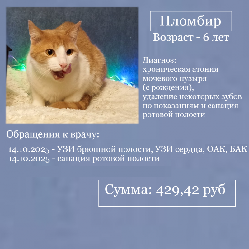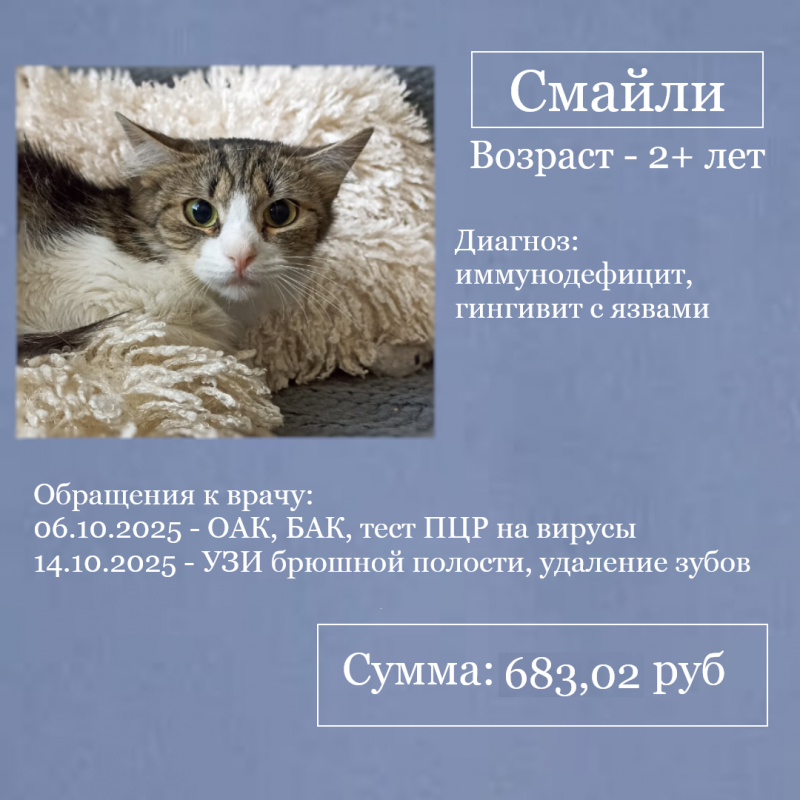 Сейчас пришло время оплачивать эти счета, сумма долга за троих котов для нашей команды очень большая. Мы не справимся в одиночку - просим вас принести волшебство и подарить нашим мурлыкам свежую улыбку!