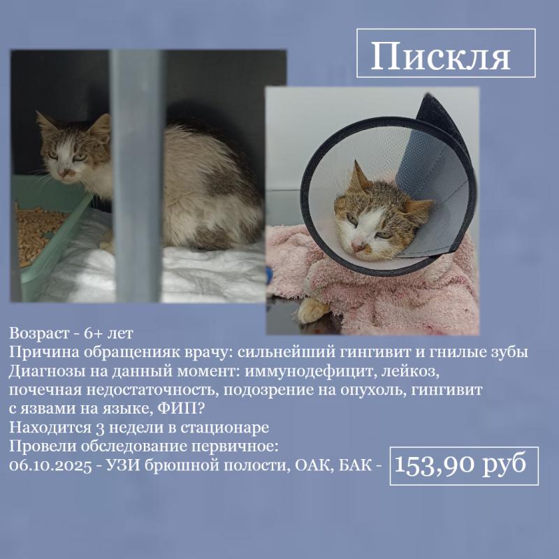 В деле помощи бездомным животным всегда много неопределенности. Мы не знаем, что было с животным ДО, и часто не знаем, что будет ПОСЛЕ. Обычно, у нас есть только ЗДЕСЬ и СЕЙЧАС. Так и вышло с кошкой по имени Пискля, которая просто оказалась в тяжелом состоянии на улице в одном из городских дворов. Не добавляли определенности и неутешительные диагнозы (лейкоз, иммунодефицит, хроническая почечная недостаточность, гингивит, инфекционный перитонит кошек). Но мы справились! Благодаря профессионализму и упорству врачей, самый тяжелый период уже позади. Длительное лечение дало результаты, и теперь у Пискли точно будет теплое и уютное, безопасное ПОСЛЕ. Такой путь невозможно пройти в одиночку, особенно без финансовой поддержки.